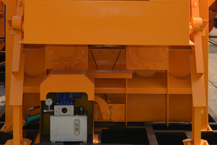 ●JS1000攪拌機(jī)采用液壓系統(tǒng)驅(qū)動(dòng),與傳動(dòng)的氣動(dòng)形式相比具有結(jié)構(gòu)緊湊、動(dòng)作平穩(wěn)、開門定位準(zhǔn)確、能手動(dòng)開門等特點(diǎn),油泵系統(tǒng)產(chǎn)生的高壓油通過控制系統(tǒng),經(jīng)高壓油管的作用到油缸驅(qū)動(dòng)力料門的開關(guān),以實(shí)現(xiàn)卸料門的開門到位的任意調(diào)節(jié),以實(shí)現(xiàn)不同的卸料速度。